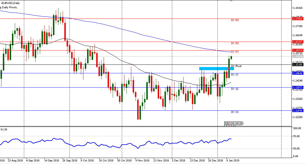 Analisa teknikal EURUSD hari ini diprediksi masih akan meneruskan kenaikan dengan resisten terdekat di level 1.15874 (R1 Pivot daily).