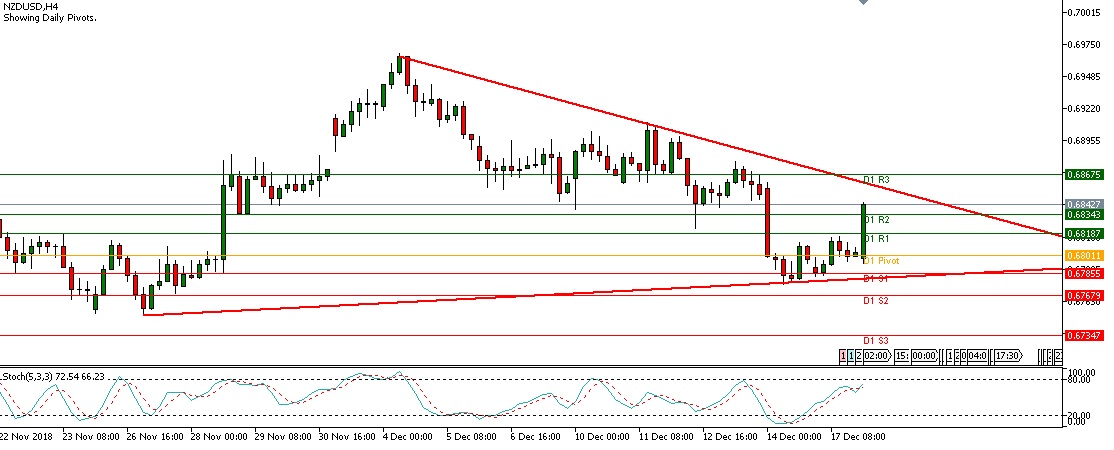 Pairs NZDUSD membentuk pola “Triangle” dan sedang bergerak di dekat support trendline, diprediksi akan mencoba naik kearah resisten trendline. Pada perdagangan hari ini dibuka pada level 0.67980, dibuka dibawah level 0.68011, diprediksi naik kearah pivot dan kemudian naik kearah resisten satu (R1) di level 0.68187, bahkan naik kearah resisten dua (R2) di level 0.68343 dan jika kuat aknb mencoba naik kearah resisten tiga (R3) di level 0.68675. Untuk penutupan pasar diprediksi akan ditutup diantara level R1-R2 pivot diantara level 0.68187 – 0.68343