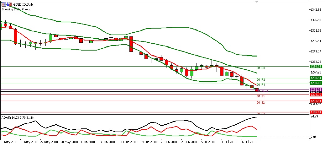 Secara teknikal, Gold diprediksi akan turun kembali ke level 1218.00 dibawah pivotnya pada bolinger tengah 5 time frame H4. Jika turun tembus level 1217.00-1218.00, maka Gold akan terus turun sesuai trend ke level 1213.10 pada support satu.