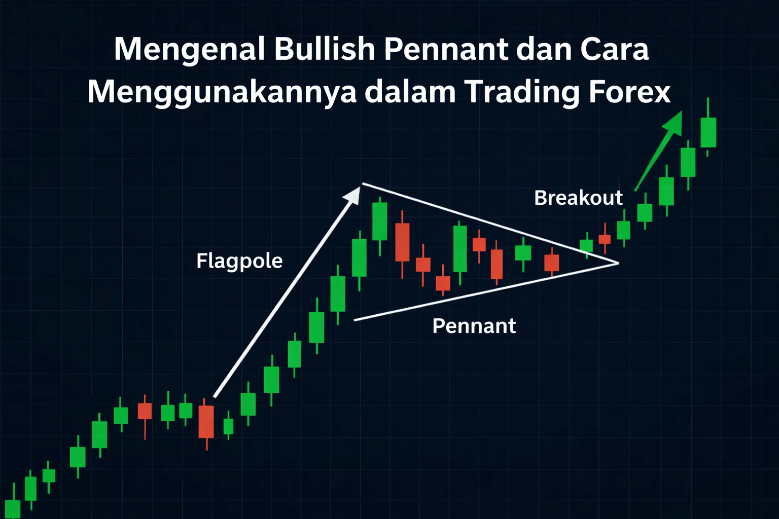 Bullish pennant adalah salah satu pola grafik dalam trading forex yang termasuk ke dalam kategori continuation pattern (pola kelanjutan), yaitu pola yang menunjukkan kemungkinan tren naik akan berlanjut setelah fase konsolidasi singkat.