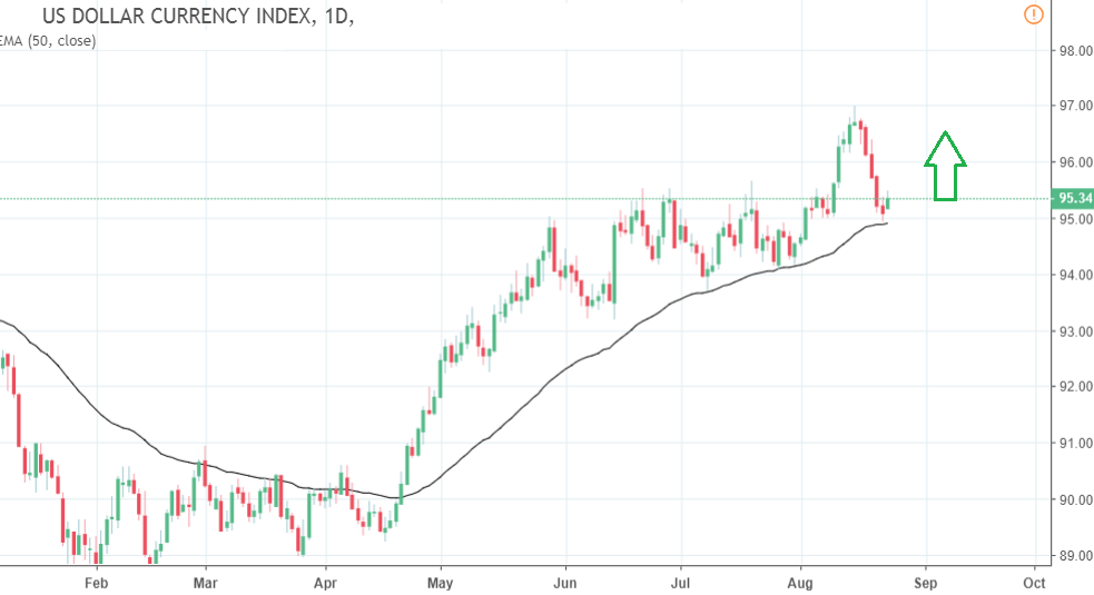 Indeks dolar AS (DXY) yang mengukur pergerakan dolar terhadap enam mata uang utama bergerak naik dengan mantap diatas level 95.00. Pada grafik harian DXY, terlihat penurunan yang terjadi sejak awal pekan ini sudah mencapai target ke support di level 95.00 dan sehingga ada dorongan memantul dari level tersebut.