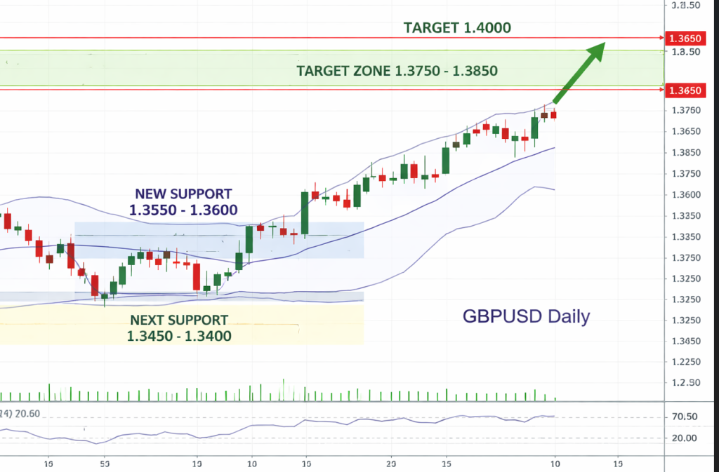 Pada time frame Daily, GBP/USD terlihat berada dalam tren naik yang kuat setelah berhasil menembus area resistance 1.3560–1.3600 dan kini bergerak di atas upper band Bollinger, menandakan momentum bullish yang solid. Harga saat ini mengincar target kenaikan berikutnya di area 1.3750–1.3850 sebagai resistance lanjutan, dengan potensi ekstensi hingga 1.4000 jika sentimen fundamental tetap mendukung. Namun, RSI yang sudah berada di kisaran overbought (sekitar 70) mengindikasikan peluang terjadinya koreksi sehat dalam jangka pendek. Level koreksi terdekat diperkirakan berada di area 1.3600–1.3550 (bekas resistance yang kini menjadi support), lalu support berikutnya di sekitar 1.3450–1.3400. Selama harga bertahan di atas zona support tersebut, bias jangka menengah GBP/USD tetap bullish dan peluang kelanjutan kenaikan masih terbuka.