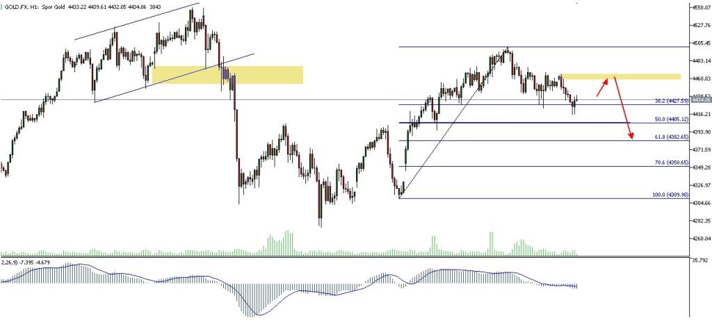 Pada grafik GOLD H1 terlihat harga berpotensi meneruskan penurunan kearah fibonacci rettracement 50% disekitar 4405.00 atau bisa lebih rendah ke zona diskon di 4383.00 – 4350.00.