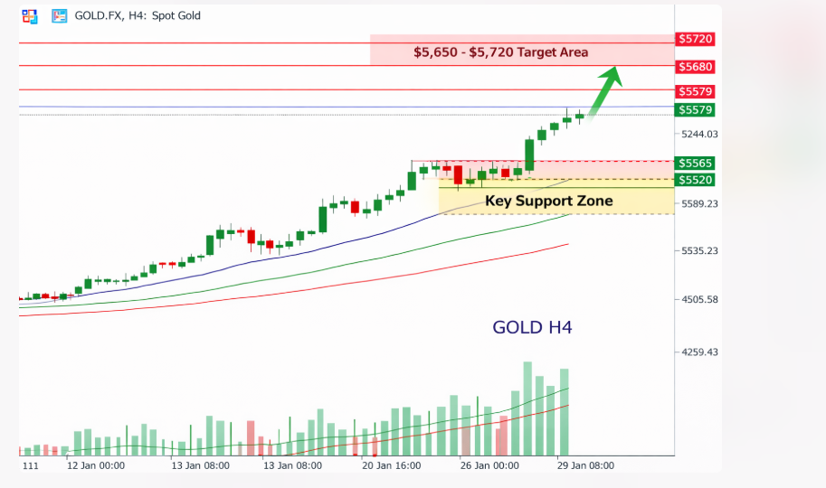 Harga emas kembali memangkas sebagian dari kenaikan kuat dalam perdagangan harian setelah sebelumnya mencetak rekor tertinggi sepanjang masa pada Kamis ini, dan diperdagangkan di bawah level USD 5.550 selama paruh pertama sesi Eropa. Emas melakukan koreksi sehat sebelum melanjutkan kenaikan dan berpotensi menembus level harga 5650-5724 , Emas masih didukung oleh faktor fundamental dan sentimen positif tersebut cenderung masih berlanjut menjelang penutupan perdagangan bulan Januari ini.