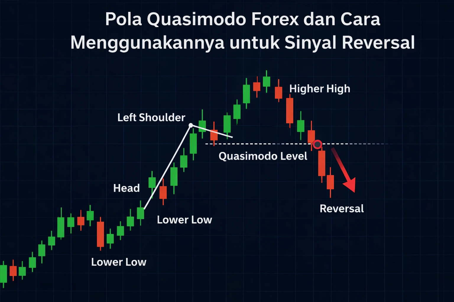 Pola quasimodo adalah salah satu pola price action dalam trading forex yang digunakan untuk mengidentifikasi sinyal pembalikan arah (reversal). Dengan memahami pola ini, trader dapat mengenali perubahan tren lebih awal dan menentukan titik entry yang lebih tepat berdasarkan struktur pergerakan harga.