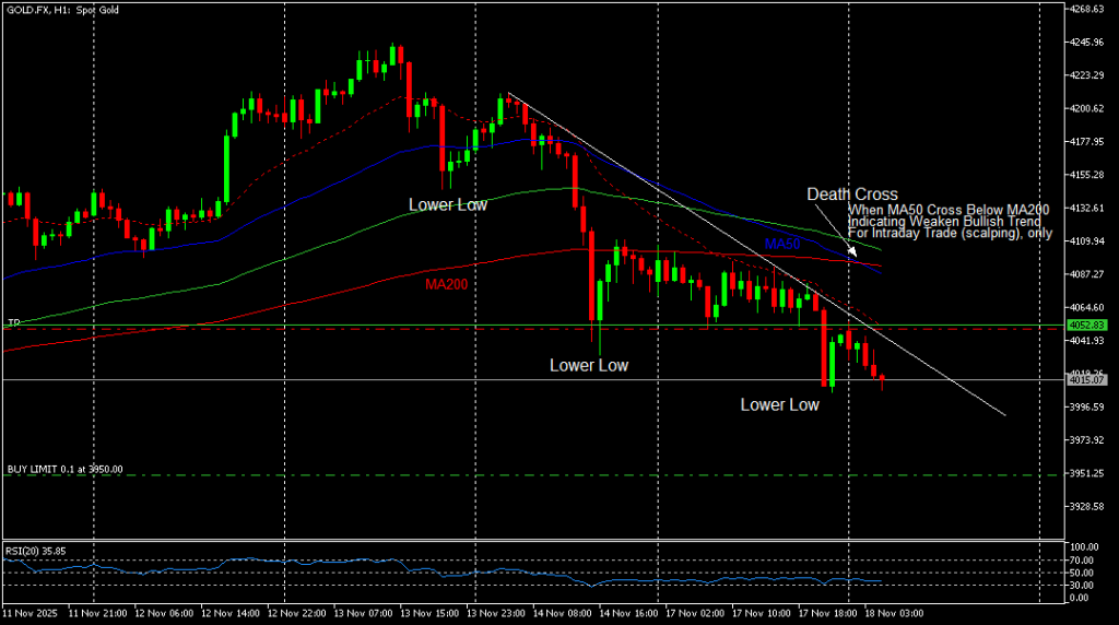 Secara teknikal, grafik pada Timeframe H1 menunjukkan tren Bearish berkelanjutan. Ini terlihat dengan terbentuknya tiga titik lower low yang jelas. Bahkan, harga sudah membuat lembah yang makin rendah secara bertahap, yang menunjukkan momentum bearish sudah berjalan bahkan sebelum death cross terjadi, penembusan MA50 memotong ke bawah MA200.