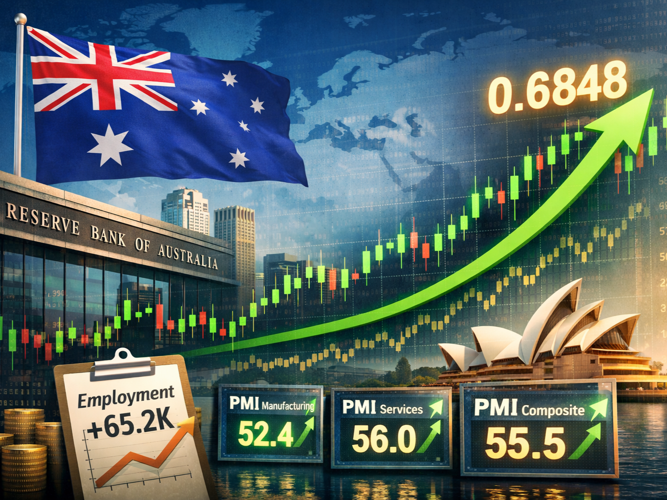 Berdasarkan laporan awal S&P Global, Indeks Manajer Pembelian (PMI) Manufaktur Australia tercatat naik menjadi 52,4 pada Januari dari 51,6 pada bulan sebelumnya. Sementara itu, PMI sektor Jasa melonjak ke level 56,0 dari 51,1, dan PMI Komposit meningkat signifikan menjadi 55,5 dibandingkan 51,0 sebelumnya. Data ini menunjukkan ekspansi aktivitas bisnis yang semakin solid di awal tahun.
