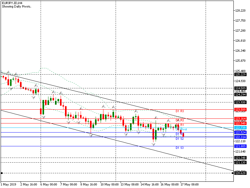 Jika candle aktual EURJPY pada grafik H4 menembus di bawah 122.314, berpotensi menuju support kritis 121.889.