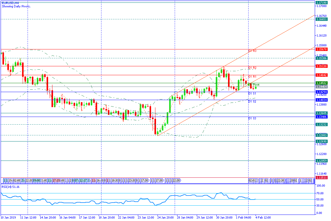 Candle aktual EURUSD pada grafik H4 nampak mendekati support 1.14294. Jika break out membuka kans menguji support kritis 1.14034.