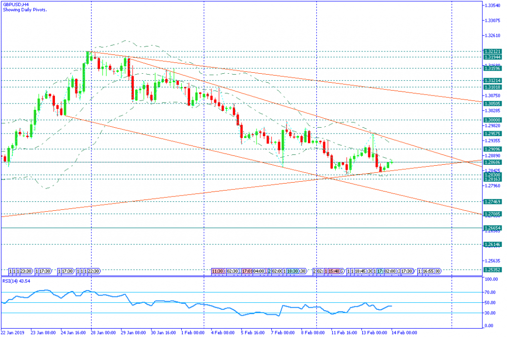 Tendensi menurun GBPUSD pada grafik H4 masih kuat dengan target area support kritis 1.28300-1.28163.