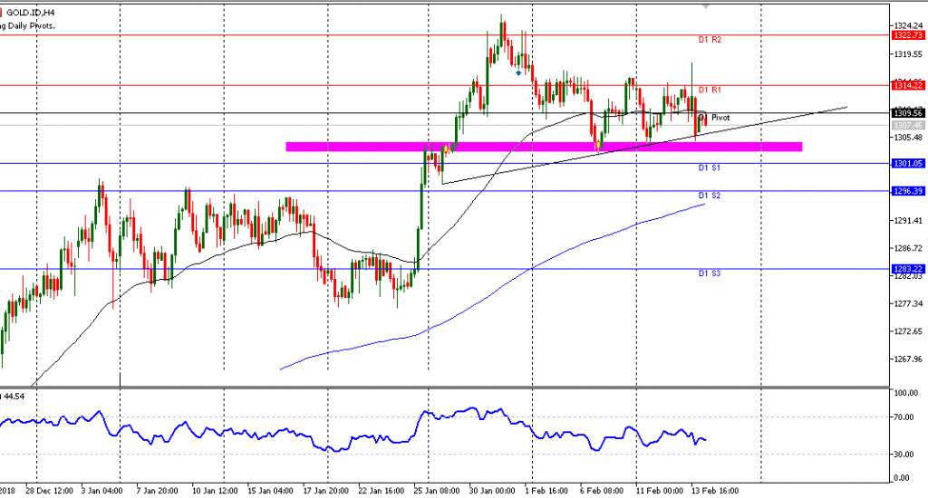 Candle actual Gold pada TF H4 terlihat tertekan dibawah Pivot Point daily dilevel 1309.56.